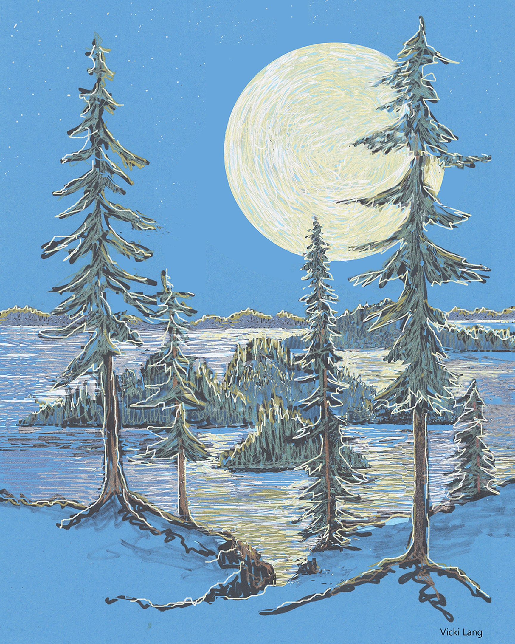 Someday my artwork may be for sale but at the present time I am having too much fun doing new images. In the meantime, we have decided to launch as a gallery and continue to offer our free printable book markers. Feel free to contact us through the website if you are interested in purchasing Evergreens with Huge Moon and we can try to figure something out!